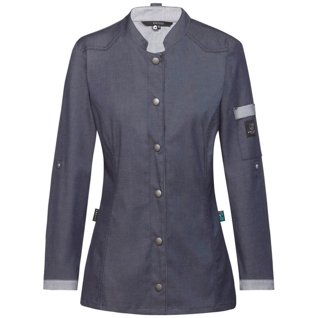 Damen-Kochjacke, langarm, Bikerstyle, GREIFF -Regular Fit -Metall-Druckknöpfe -Schulterpasse und Passe im Rücken -Krempelarm -Armtasche mit Logo -Lüftungslöcher -Wiener Nähte im Vorder- und Rückteil -Schürzenschlaufe am Kragen 240g/m² 60° waschbar
